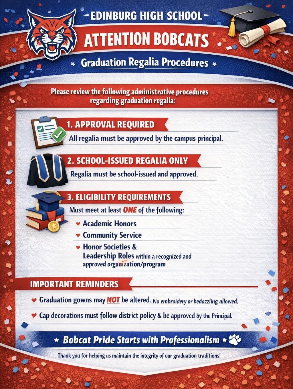 - Graduation regalia (stoles, cords, etc) must be school issued and approved by the Campus Principal.