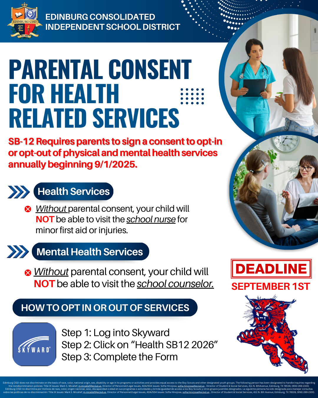 SB-12 Requires parents to sign a consent to opt-in or opt-out of physical and mental health services annually beginning 09-01-2025. Without parental consent, your child will NOT be able to visit the school nurse for minor first aid or injuries. Your child will NOT be able to briefly visit with the school counselor without your consent on file. For more information about Health Services or Student and Social Services Departments. Please sign in to your Skyward application to complete this form today.